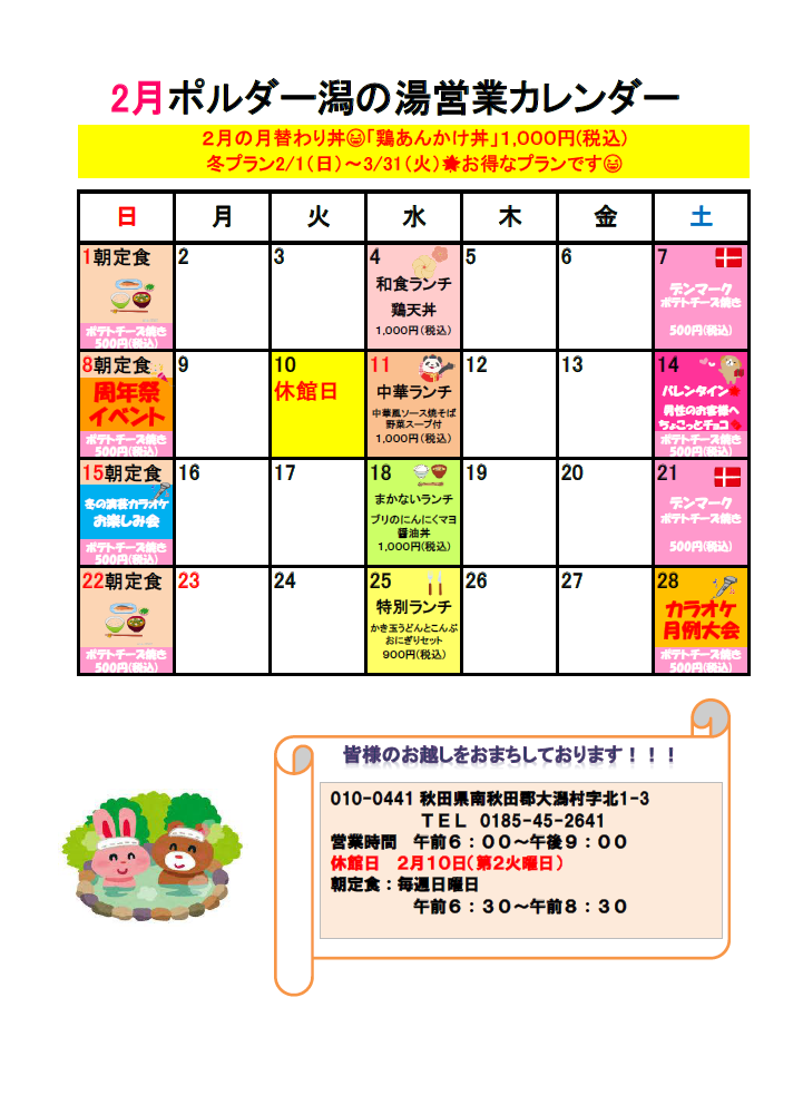 ポルダー潟の湯 2月の営業カレンダーです😆