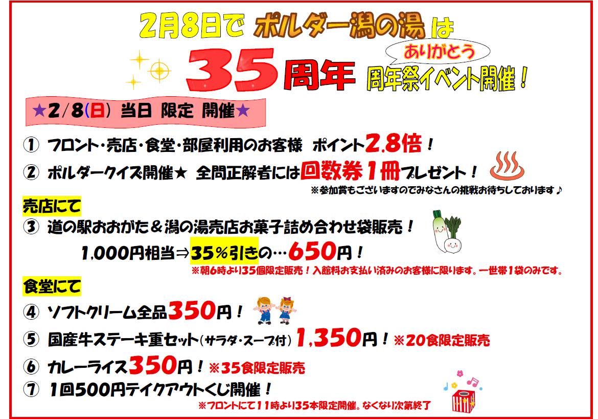 🌸2月8日でポルダー潟の湯は35周年🌸